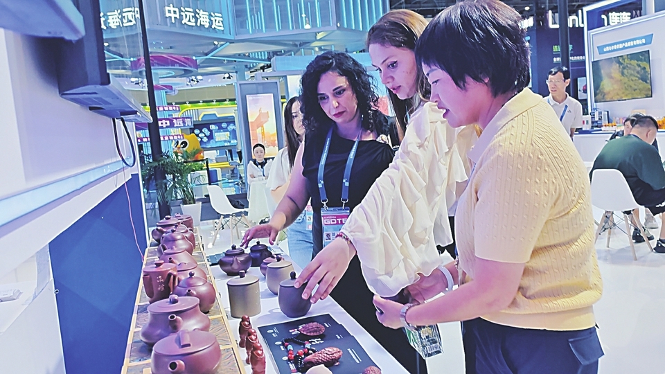 山西展區(qū)內(nèi),國際客商正在挑選產(chǎn)品。山西經(jīng)濟(jì)日報記者 宋燁 攝